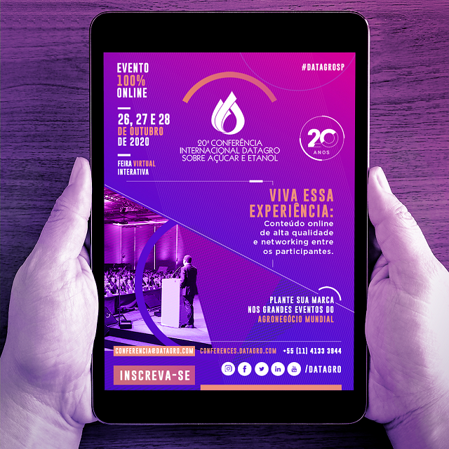 26, 27 e 28 de outubro de 2020, acontece a 20ª edição da Conferência Internacional DATAGRO sobre açúcar e etanol. Este ano o evento será realizado de forma online.