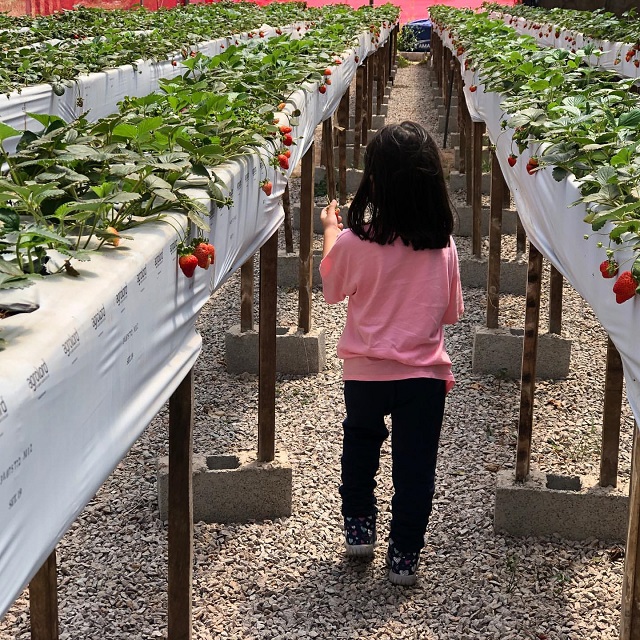 “No sistema Colha e Pague, o próprio cliente colhe os morangos, que não possuem resíduos de agrotóxicos e são cultivados no sistema semi-hidropônico”, destaca Sandra.