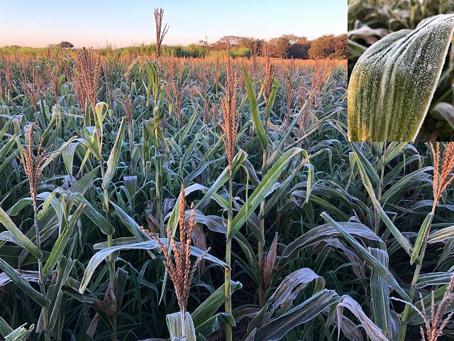 Área cultivada com milho safrinha em Dourados durante a geada no dia 30 de junho de 2021 (0,3 ºC) e duas semanas após