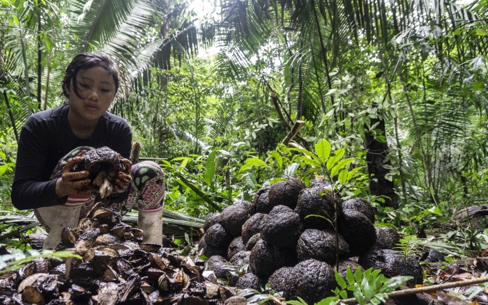 Colheita, quebra, embalagem e transporte da castanha produzida pelos WaiWai, na mata próxima ao acampamento Japim, um dos vários acampamentos instalados às margens do Rio Anauá - Foto: Rogério Assis/ISA