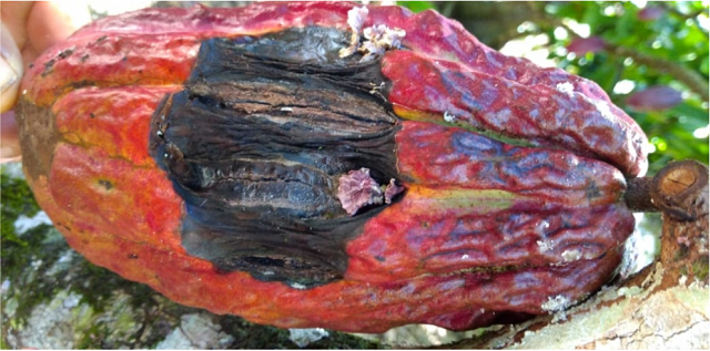 Fungo desencadeia um desequilíbrio hormonal na planta, que leva ao crescimento excessivo dos tecidos infectados e drena a energia que deveria ser usada para o crescimento de frutos e raízes, relatam pesquisadores da USP em artigo publicado na revista New Phytologist (fruto de cacau infectado, com o fungo brotando na área afetada) - Foto: acervo dos pesquisadores