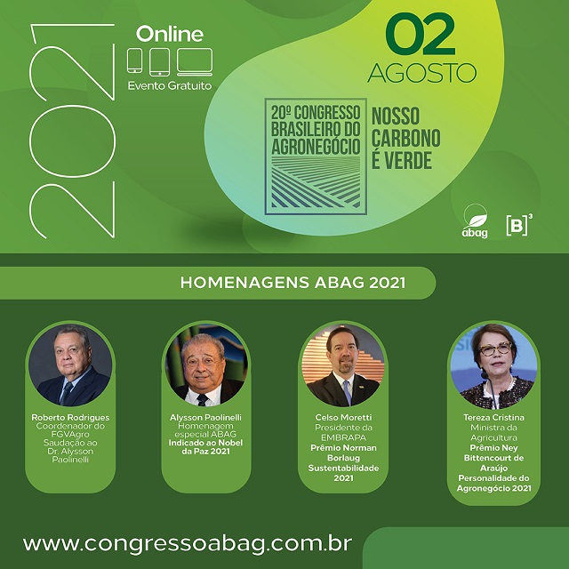 Em sintonia com os acontecimentos e aprendizados recentes, a ABAG e a B3 promoverão a 20ª edição do CBA no próximo dia 02 de agosto, este ano novamente no formato ONLINE, sob o tema Nosso Carbono é Verde, uma ampla discussão sobre o peso geopolítico que o Brasil tem no campo da segurança alimentar e energética, a importância da preservação do meio ambiente, a necessidade de mecanismos financeiros eficientes e sobre os investimentos sustentáveis, baseados no ESG.