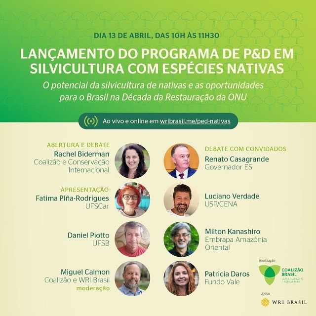 mais de 280 representantes do agronegócio, setor financeiro, sociedade civil e academia - lança o Programa de Pesquisa e Desenvolvimento em Silvicultura com Espécies Nativas (PP&D-SEN) no próximo dia 13 de abril, às 10h. Para acompanhar, basta clicar