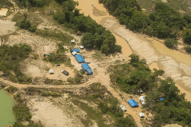 Do avião, flagramos enormes crateras abertas em plena área protegida de Floresta Amazônica. Imagens chocantes revelam ganância e sede de destruição: dezenas de retroescavadeiras, acampamentos armados e muitos homens trabalhando. Foi possível avistar até mesmo um avião com pista de pouso dentro dos limites do território indígena, o que mostra não haver preocupação por parte dos criminosos de serem punidos.