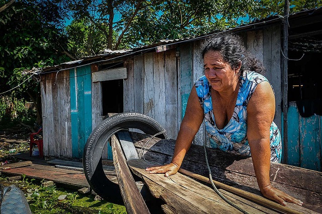Sônia Freitas da Silva, 58, está há mais de um mês sem poder trabalhar por conta da cheia do Rio Negro, em Manaus. Ela mora desde os 19 anos na orla da cidade - Foto: Alberto Cesar Araújo/Amazônia Real