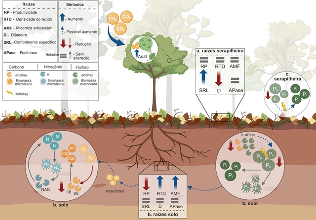 Assim, a pesquisa mostra que tanto plantas quanto microrganismos se reorganizaram rapidamente para absorver nutrientes diante do cenário atípico. “Essa rápida adaptabilidade da comunidade de plantas, investindo em múltiplas estratégias para aquisição de nutrientes, reforça a importância da interação com o fósforo para a possível capacidade da floresta de continuar atuando como um sumidouro de carbono e resiliência da floresta frente às mudanças climáticas”, explica Nathielly Martins, autora principal do estudo.