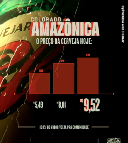 Pela segunda semana consecutiva, a lata de Colorado Amazônica, cerveja que tem como propósito chamar atenção dos consumidores para a importância da proteção e da conservação da Amazônia, além de valorizar a região que apresenta a maior biodiversidade do país, divulga novo reajuste. Com base nos índices de desmatamento da floresta, o preço da cerveja passou de R$8,01 para R$ 9,52, um aumento de 18,8%.