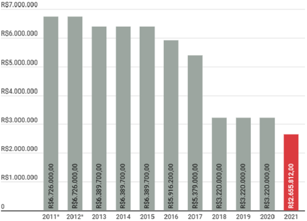 Em relação a 2020, o orçamento para a Ação 20V9 – na qual os programas Queimadas, Deter e Prodes, desenvolvidos pelo Instituto de Pesquisas Espaciais (INPE), estão inseridos – caiu 17,5%.
