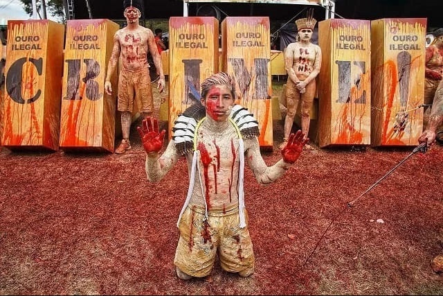 Barras de ouro extraídas ilegalmente foram representadas na marcha desta segunda-feira (11/04) – Foto: Tuane Fernandes/Greenpeace