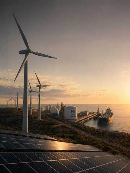 Hidrogênio verde redesenha o mapa da energia ao conectar vento, sol e porto em uma mesma equação industrial de escala global - Imagem gerada por IA - Foto: Ilustrativa/Neo Mondo