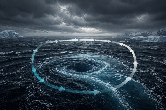 O mecanismo físico por trás do colapso precisa ser compreendido não como abstração oceânica, mas como engenharia climática planetária em desintegração. A AMOC funciona como uma correia de transmissão termohalina: água quente e salgada sobe pela superfície atlântica em direção ao norte, aquece a Europa Ocidental, a Escandinávia e o Ártico, resfria ao atingir os mares próximos à Islândia e à Groenlândia, torna-se mais densa e afunda ao fundo do oceano, de onde retorna às profundezas rumo ao sul. O derretimento acelerado da calota da Groenlândia injeta água doce nesse sistema em volume crescente, compromete o afundamento e aplica freios graduais a uma corrente que os continentes atlânticos há milênios tomaram como garantida.