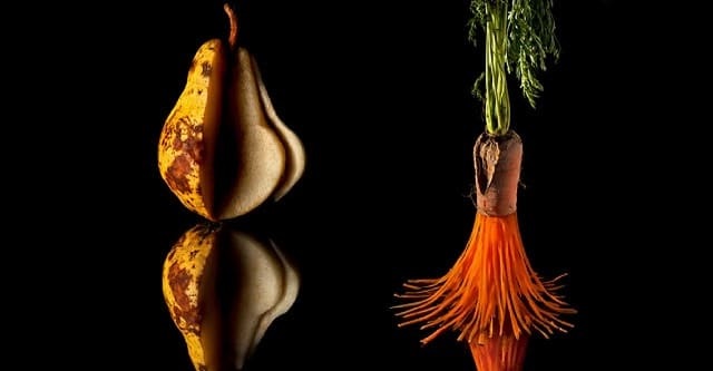 “O projeto nasceu na sequência da proposta que me foi feita em 2014 pelos bancos alimentares para trabalhar como artista fotógrafa na questão do combate ao desperdício”, explica Pauline. “Explorando a questão da atração e repulsão de acordo com os critérios sociais do ambiente, o trabalho se concentrou na revelação da beleza invisível e interior, jogando tanto com o realce quanto com a estética pura da matéria, humor ou imaginação. Com essa série, tive o prazer de frustrar a ditadura da beleza tão prevalente em nossas sociedades e da qual participo indiretamente como fotógrafa publicitária de culinária.”
