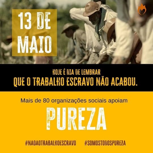 Já se passaram 134 anos da assinatura da Lei Áurea e o trabalho escravo continua sendo praticado no Brasil. Com o intuito de alertar a população sobre este fato, será realizado na próxima sexta-feira, dia 13 de maio, um tuitaço pelo fim desta atividade criminosa, organizado pela produção do longa “Pureza”, de Renato Barbieri, que estreia dia 19 de maio, e trata deste tema. Para participar, basta compartilhar seu post nas mídias sociais no dia 13, às 13h, com as hashtags #NaoAoTrabalhoEscravo, #Purezaofilme e #SomosTodosPureza.