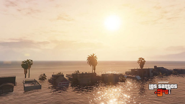 Imagem do jogo mostra a cidade de Los Santos submersa por conta da crise climática - Imagem: (Divulgação)