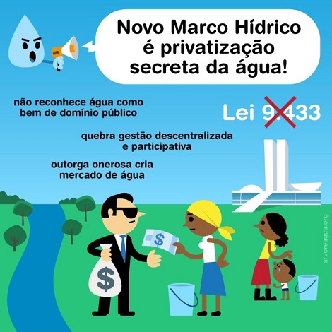 A proposta deste novo marco impacta drasticamente a Política Nacional de Recursos Hídricos e descaracteriza princípios e fundamentos da lei 9433 e da gestão descentralizada e participativa, abrindo possibilidade para a privatização da água. O projeto que sequer foi apresentado formalmente em reunião do Conselho Nacional de Recursos Hídricos está sendo enviado para o Congresso Nacional, sem transparência nem debate com os organismos que fazem parte do Sistema Nacional de Gerenciamento de Recursos Hídricos (SINGREH). Vale destacar que a Lei 9433/1997, que institui a Política Nacional de Recursos Hídricos é fruto de ampla discussão, que resultou na gestão descentralizada e participativa das águas.