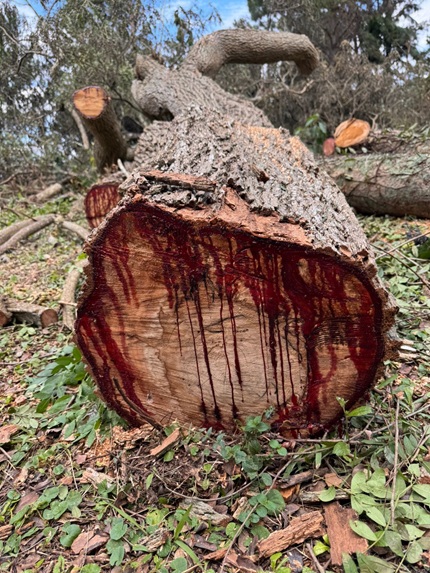 Floresta da Fazendinha, Carapicuíba (SP) — A seiva vermelho-sangue escorre do tronco recém-cortado de uma árvore derrubada pelo loteamento Vitta São Camilo. A cor não é acidente: é a resposta biológica de uma árvore adulta à morte por serrada - Foto: Divulgação